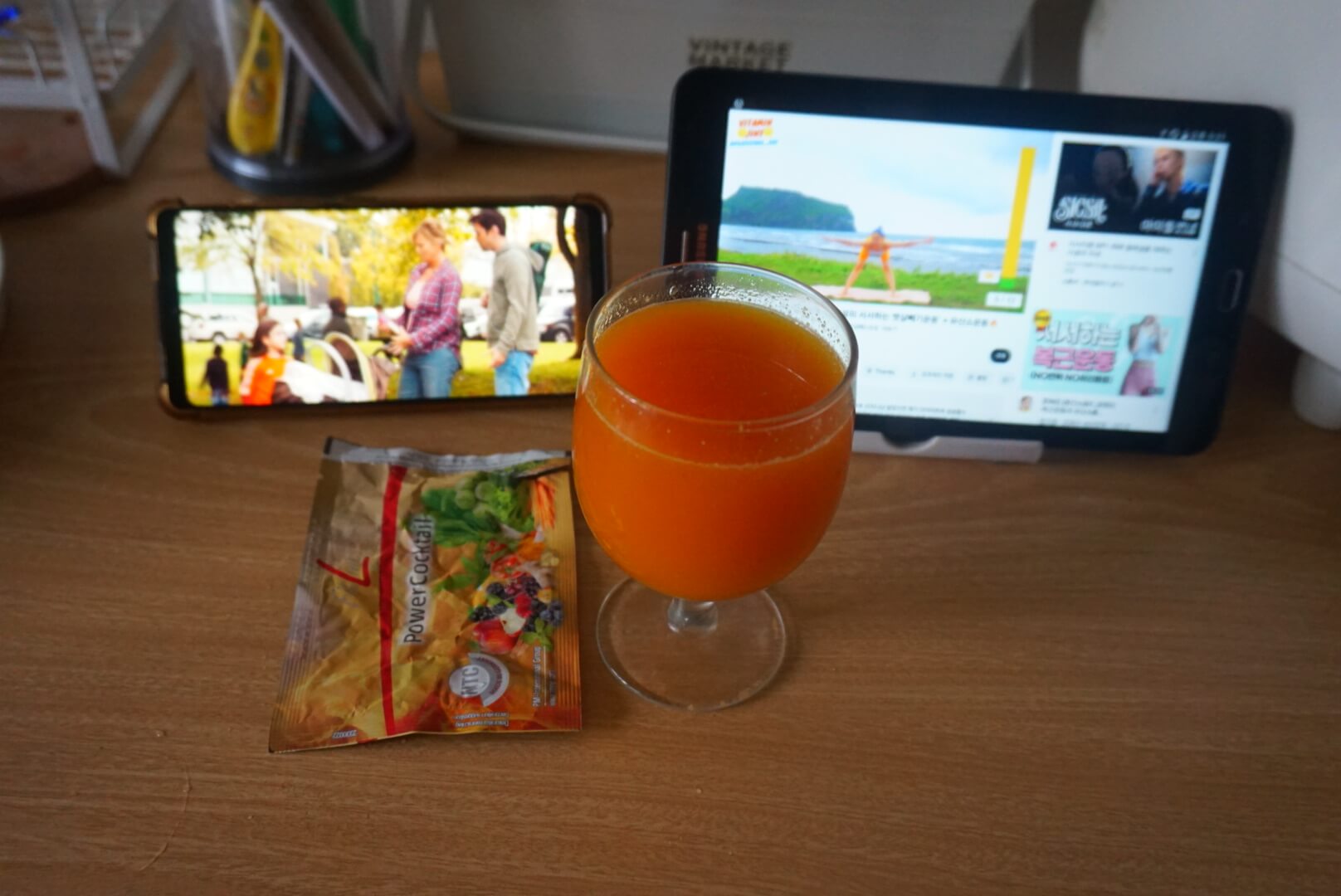 먼저 파워칵테일은 56가지 이상의 자연 성분이 한 포에 담긴 주스예요. 과일, 채소, 허브는 물론 비타민, 미네랄, 항산화 성분까지! 그야말로 하루치 영양을 한 번에 담은 건강폭탄이라고 볼 수 있어요 🍎🥕🍋🌿. 성분으로는 당근, 토마토, 브로콜리, 강황, 블루베리, 미니양배추,마늘, 스피루리나 등등이 포함되어 있는데, 이것들을 따로 챙기기란 현실적으로 불가능하잖아요. 그런데 물에만 타서 한 잔 마시면 끝! 정말 간편하고, 무엇보다 천연 과일 맛 덕분에 거부감 없이 마실 수 있어서 너무 좋아요.인공첨가물,합성첨가물,설탕 일절 들어있지 않아요.