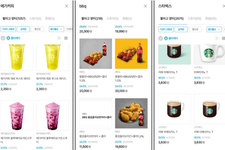 팔라고는 치킨, 커피, 피자, 편의점 등 다양한 브랜드의 기프티콘을