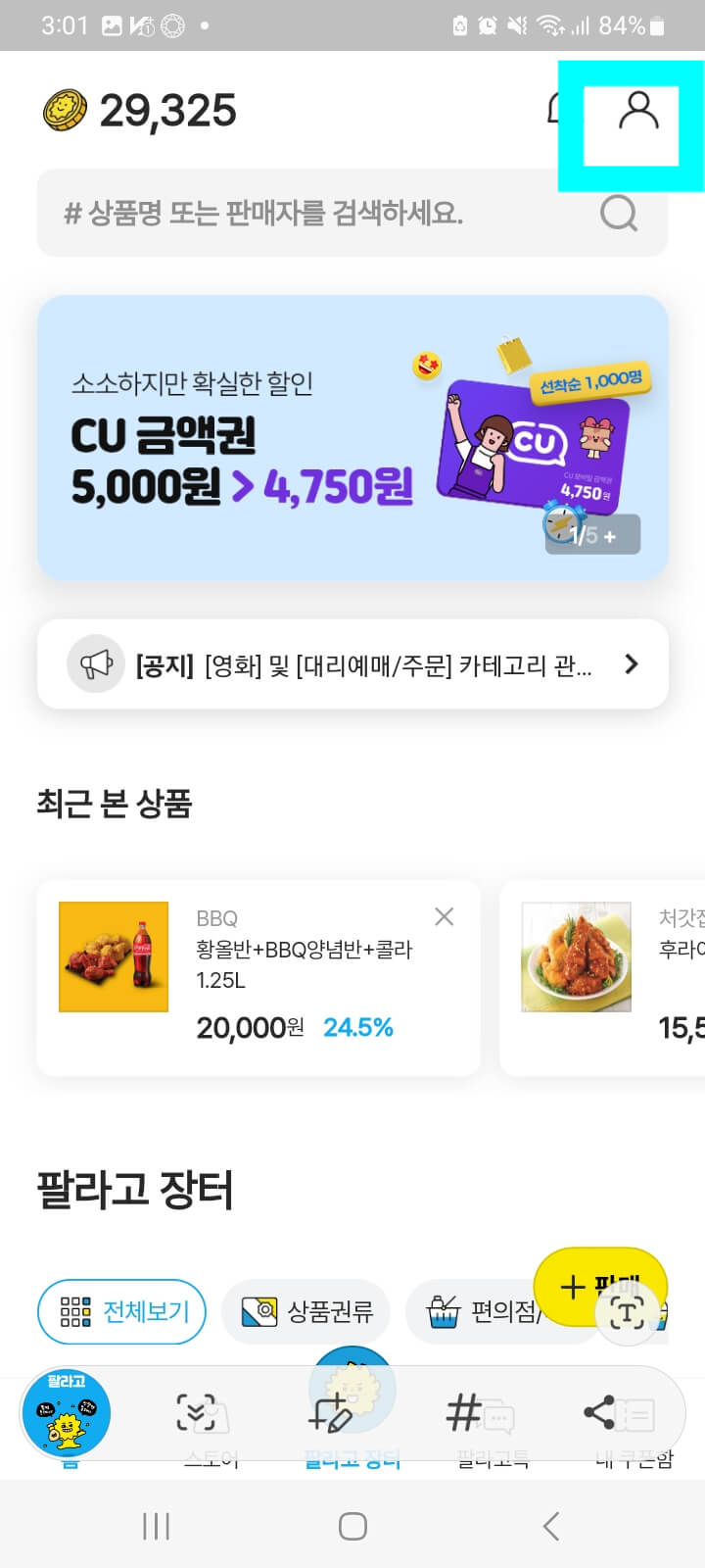팔라고앱 접속 >사람모양 클릭>"팔라고 이렇게 이용하자!" 배너 클릭