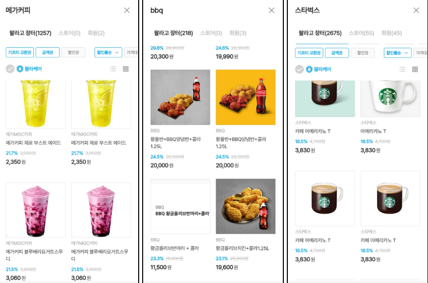 예를 들어 피자 기프티콘은 최대 50% 할인, 커피는 20% 내외,