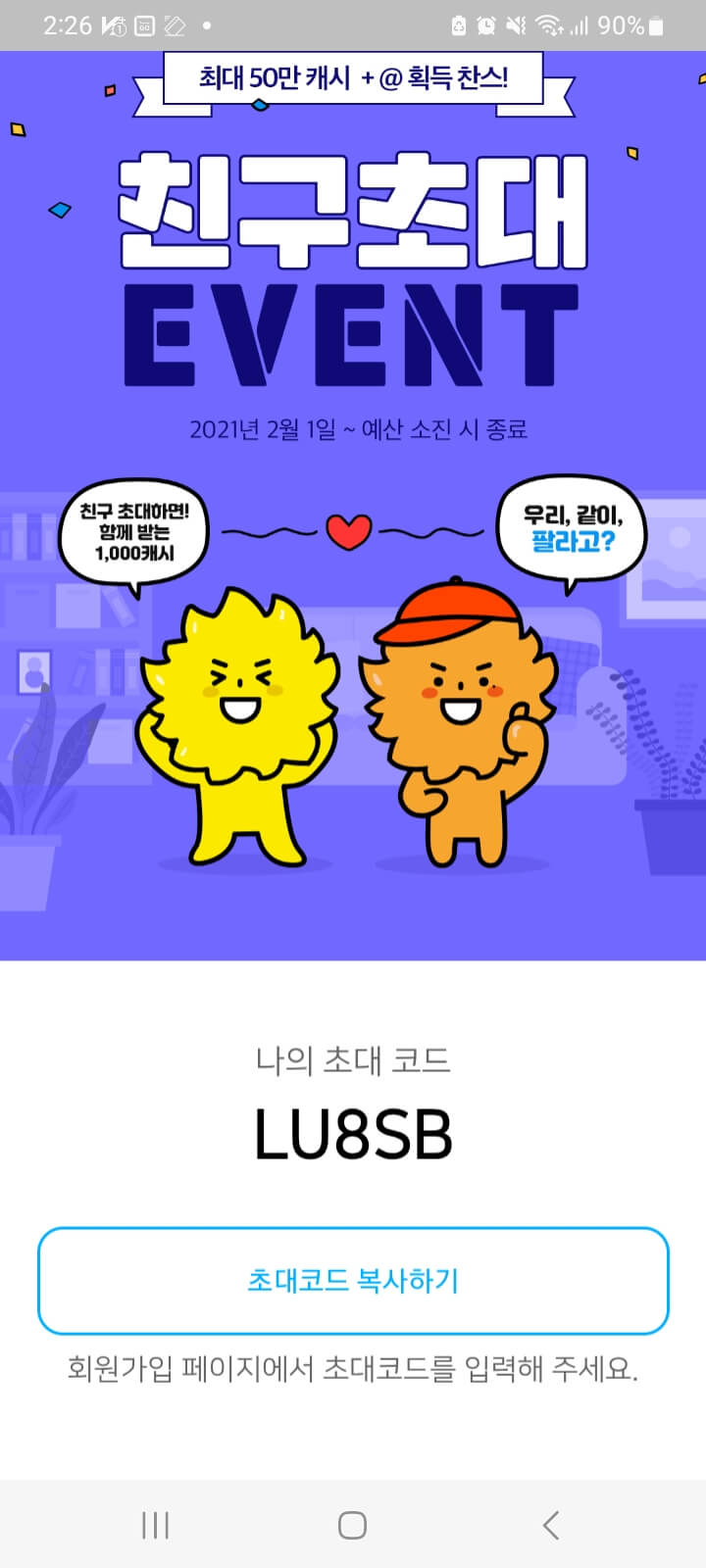게다가 초대한 사람과 초대받은 사람 모두 캐시를 받는 구조라